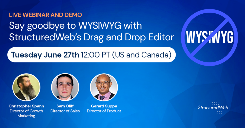 Join us on June 27th at 12:00 PT for a webinar and live demo to discover how StructuredWeb’s Drag and Drop Editor can revolutionize your content creation process.
